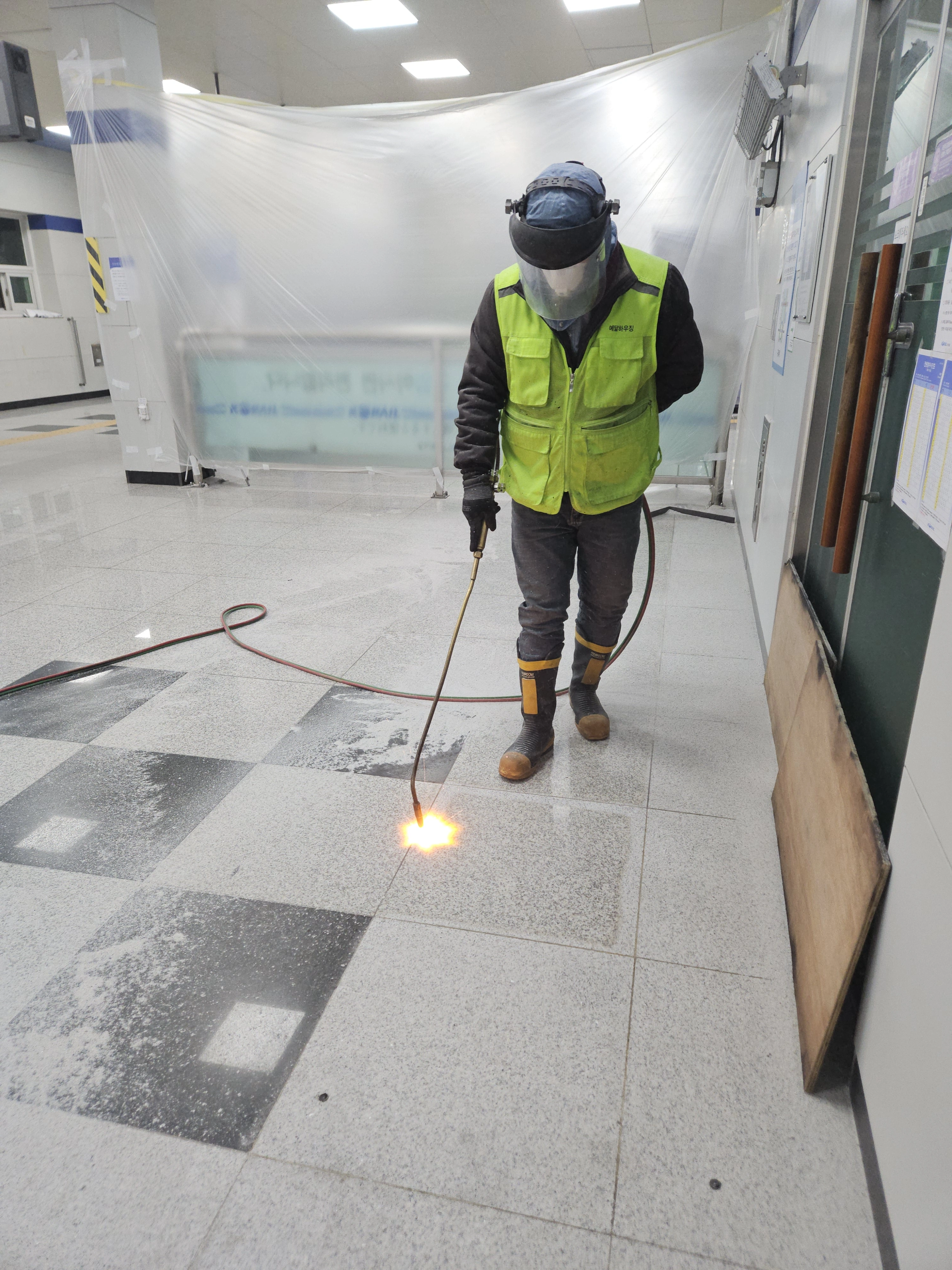 버너구이 공법은 화강석 표면을 고온의 버너로 처리해 표면 조직을 거칠게 만들어 마찰력을 높이는 방식입니다. 화학 약품을 사용하지 않고 열처리만으로 미끄럼을 방지하며, 역사 환경에서도 내구성이 뛰어납니다. 기존 화강석을 교체하지 않고 표면만 처리하므로 시공 시간이 짧고 역사 운영에 미치는 영향을 최소화할 수 있습니다.